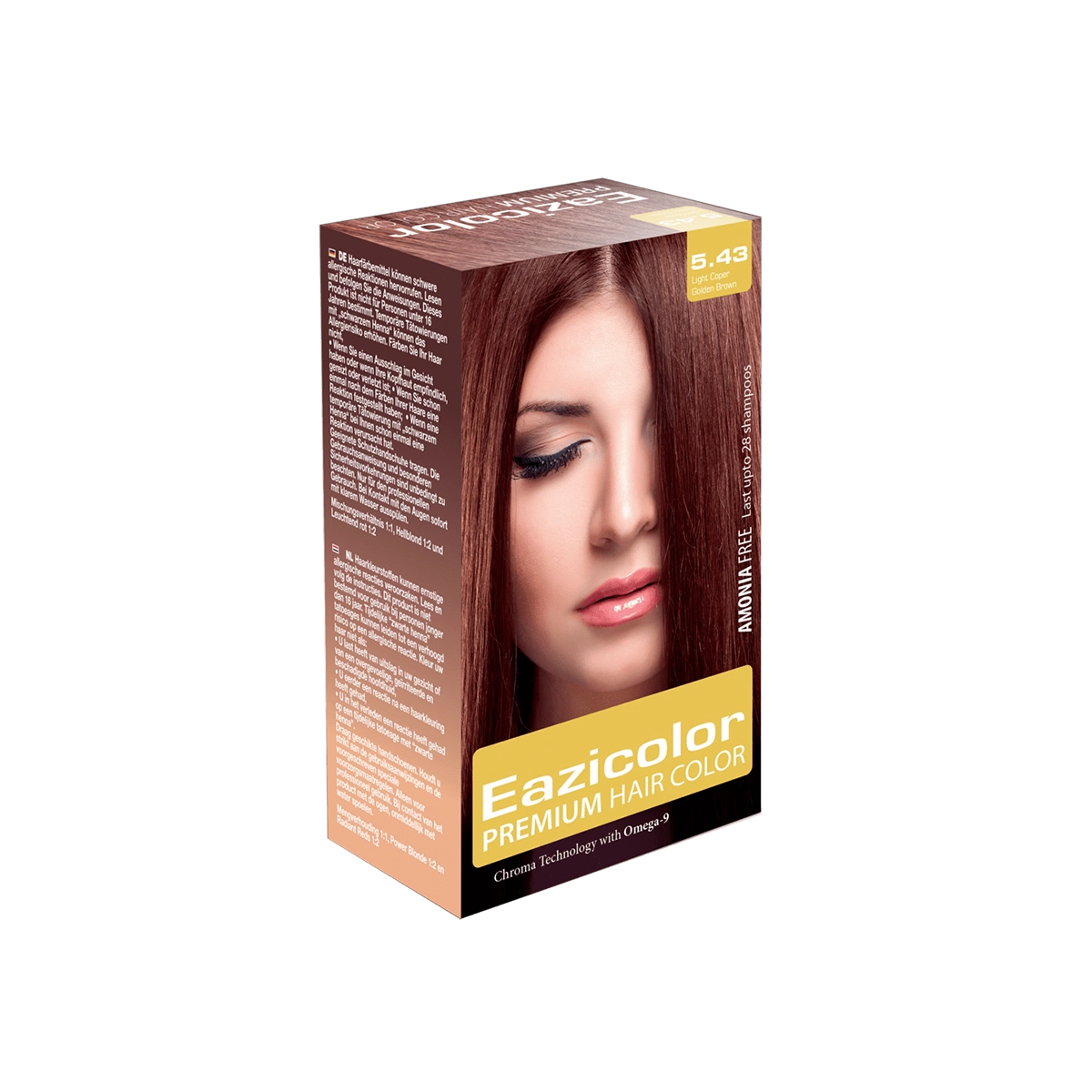 EAZICOLOR Premium Women Hair Color in shade 5.43 exudes a unique blend of warm brown tones and a subtle reddish accent designed to flatter all complexions. The high-quality formula ensures even coverage, effectively concealing greys and delivering a consistent finish. With every application, you’ll enjoy salon-like results right in the comfort of your home. Perfect for experienced users and beginners alike, EAZICOLOR takes hair coloring to a professional level with its smooth blending capability.